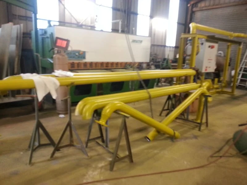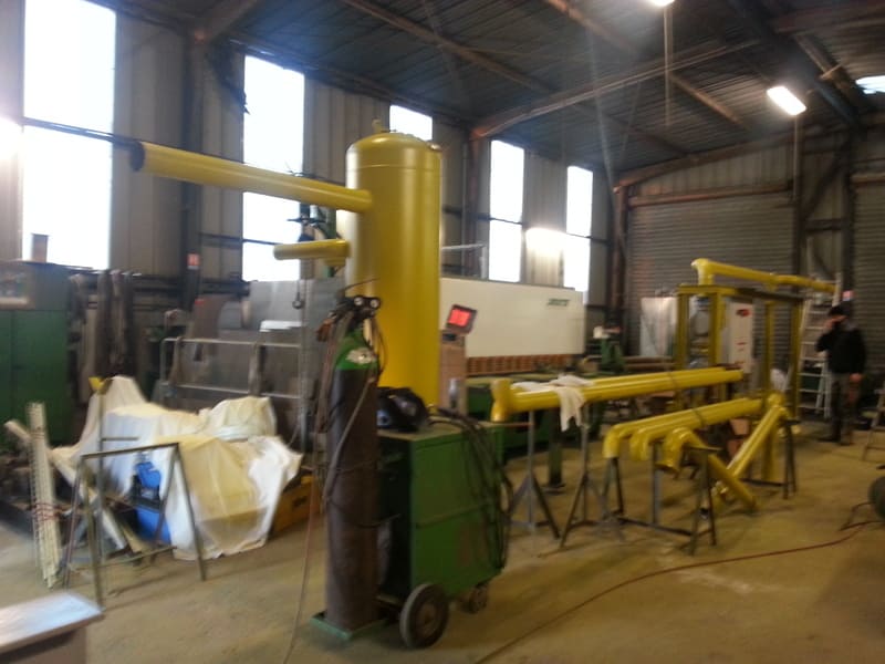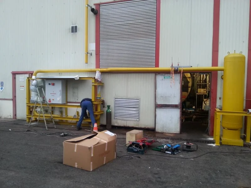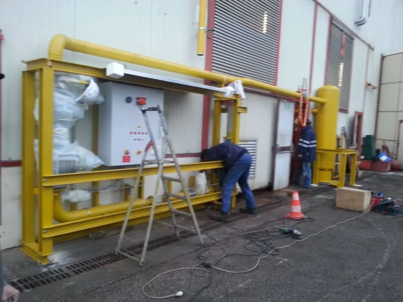L’installation proprement dite a débuté par la pose de la chaudière vapeur industrielle. Les composants principaux ont été positionnés selon les préconisations du fabricant et les plans définis lors de l’étude technique. Les raccordements nécessaires pour l’alimentation en combustible, en eau et en dérivations vapeur ont été réalisés avec rigueur afin d’assurer une intégration efficace dans l’installation existante de l’usine.